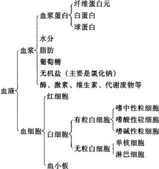 图1-13 血液循环模式图 1.右心室 2.左心室 3.右心房 4.左心房 5.主动脉 6.臂头动脉总干 7.肺动脉 8.腹腔动脉 9.肾动脉 10.肠系膜前动脉 11.肠系膜后动脉 12.头部毛细血管 13.前肢毛细血管 14.肺毛细血管 15.肝毛细血管 16.后肢毛细血管 17.后腔静脉 18.肺静脉 19.门静脉 20.肝静脉 21.前腔静脉 (3)血液 血管内流动的液体为血液,由液态的血浆和悬浮于血浆中的血细胞构成(表1-3)。血液中的水分、血浆蛋白以及红细胞内的血红蛋白起重要的运输气体、营养和激素的作用;血液中的白细胞对细菌和病毒有吞噬、杀灭作用;血液中的血小板在出血时参与血液凝固,对机体起保护作用。 表1-3 血液细胞构成