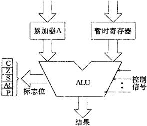 | 释义 | 微处理器组成 微处理器由算术逻辑部件(ALU)、控制部件(CU)、寄存器和堆栈组成。 1.算术逻辑部件 算术逻辑部件(ALU)的结构框图如图1.2.1-1所示。