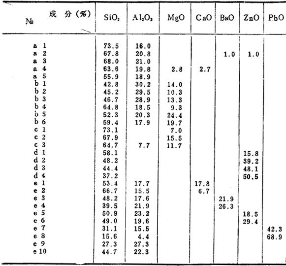 (注)(a)“Li2O-Al2O3-SiO2”系,抗热冲击性强。 (b)“MgO-Al2O3-SiO2”系,电绝缘性强。 (c)“Li2O-MgO-SiO2”系, (d)“Li2O-ZnP-SiO2”系,机械强度高。 (e)各种铝硅酸盐。 |