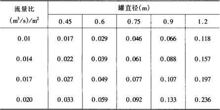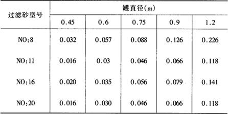 砂过滤器的流量比一般为0.01~0.02(m3/s)/m2。对于一般灌溉水质的水源,可选用流量比为0.017(m3/s)/m2的砂过滤器,如果灌溉水中含有较多的悬浮固体物,就应该选用流量比较低的砂过滤器。使用不同过滤砂所制成的过滤器的过滤能力和反冲洗时所需的流量,见表8-40和表8-41。 表8-40 砂过滤器流量表(单罐)