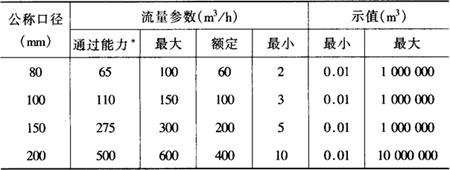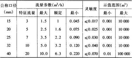 *特征流量是指水头损失为10m时通过的流量。 当系统流量较大时,可以选用水平螺翼式水表。此种水表的工作水温与允许最大工作压力与LXS型旋翼式水表相同。其主要技术参数见表8-49。 表8-49 水平螺翼式水表主要技术参数
