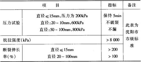 *通过能力为水头损失1m时通过水表的水量。 4.输水管道 微灌系统中输水管道最常见的是塑料管,为了防止光线透过管壁进入管内,引起藻类等微生物在管道内的繁殖,增强抗老化性能,要求管道为黑或灰色,外观要求光滑平整、无气泡、无裂口、无沟纹、无凹陷和杂质等。管道同一截面的壁厚偏差不得超过14%。 常用微灌系统的塑料管主要技术参数及规格分别见表8-50、表8-51、表8-52和表8-53。 表8-50 高压聚乙烯管道物理机械性能指标