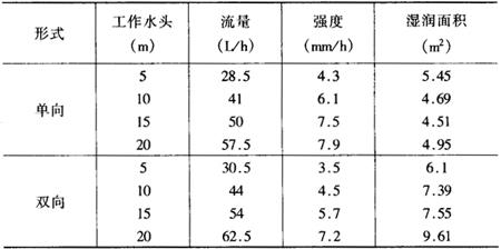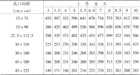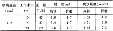 *又叫树行毛管。 (6)微喷头:微喷头的主要技术参数有工作水头(扬程)、流量、射程、喷水强度(参见喷灌机械技术参数一部分)和湿润面积等。 折射式喷水头的水力性能见表8-56。射流旋转式微喷头的水力性能见表8-57。 表8-56 折射微喷头水力性能