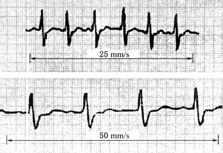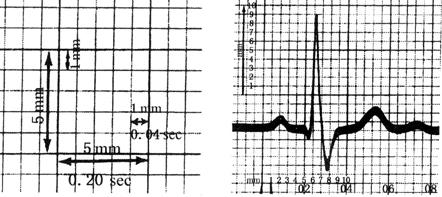 | 释义 | 心电图的测量方法 心电图走纸速度常采用25mm/s,使1mm横向间距=0.04s。定标10mm,1mm振幅相当于0.1mV。根据波幅大小,应调整电压参数。 心电图的测量如图19所示。不同走纸速度描记的心电图如图20所示。