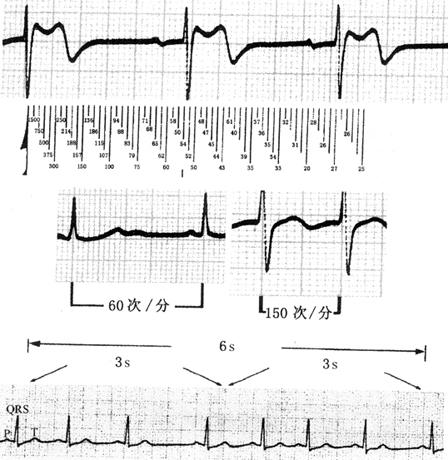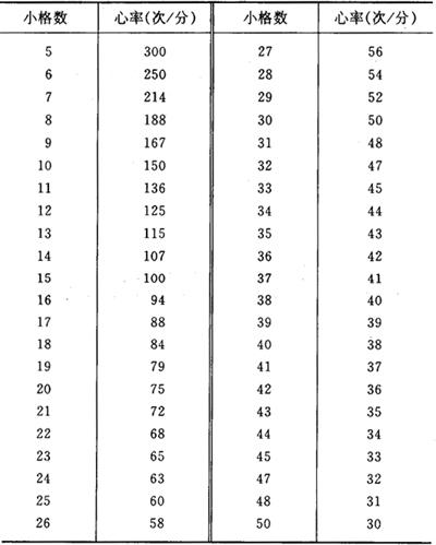 图20 不同走纸速度描记的心电图 测量方法包括: ·6s或3s计算法; ·R-R间距测量法; ·心率计算尺测量法; ·R-R间距小格计算法(表2)。 表2 R-R间期中小格(0.04s)数与心率的关系