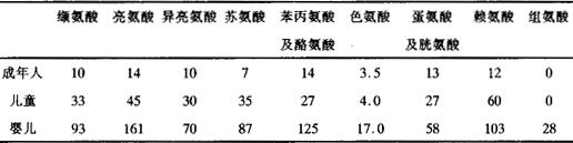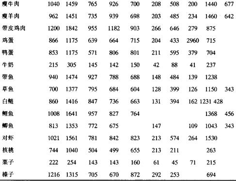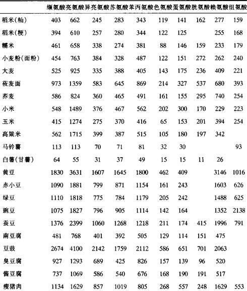 从附表3可以看出,按单位体重计算,小儿比成年人需要更多的氨基酸,婴儿需要最多。蛋白质是人体所需氨基酸的主要来源,保证足量蛋白质的供应,是小儿健康成长的必要条件。 对于一般家庭来讲,并没有必要熟记二十几种氨基酸的必需、半必需和非必需分类,实际这些氨基酸在一般食物蛋白质中都多少含有,不必另外追求。因为许多氨基酸不仅需要一定的量,还需要几种氨基酸间保持一定的比值。一般而言,动物蛋白质的生物学价值比植物蛋白质高。生物学价值的高低取决于蛋白质中主要氨基酸的含量和比值。与人体组织中氨基酸比值愈接近,生物学价值愈高,如鸡蛋蛋白质的生物价值最高,而黄豆蛋白质中苯丙氨酸、蛋氨酸两种必需氨基酸较少,面粉、花生等的蛋氨酸、赖氨酸两种氨基酸也较少,所以其生物学价值较低。有人根据蛋白质所含必需氨基酸的种类、多少,将蛋白质分为完全蛋白质和不完全蛋白质两类。动物蛋白质大部分为完全蛋白质,而植物蛋白质则不完全者居多。存在于乳汁中的乳白蛋白,存在于鸡卵中的卵黄蛋白、卵白蛋白最适于生长的需要,其次优良者为肉中之蛋白质。米、麦中的麸蛋白、乳汁中的酪蛋白、玉米中之谷蛋白及大豆中之甘蛋白等。但各种蛋白质之间的营养价值有补偿及增强之作用。早在二十世纪初期,就有人注意:一份牛肉蛋白质与二份植物蛋白质混合后,对动物促进生长之功效与纯牛肉无异。也有人观察,中国民间食品,玉米、小米和大豆三者混合粉的营养价值,远比单一的这三者任何一种的营养价值为高。因此,食物不过分单一,从营养学角度来看,也是有意义的。 附表4系据《食物成分表》(第三版,人民卫生出版社1989:165-174)表三摘录、整理的常用食物中必需氨基酸含量。表中数字为每100g食部所含氨基酸的mg数。食物中的蛋白质含量受各种条件的影响,并不恒定。表中数据仅供选择食物、计算营养量时参考。 附表4 常用食物中的必需氨基酸的含量(mg/100g食部)