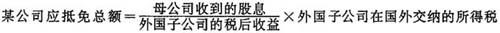 美国税法规定,跨国公司在国外获得的收益(积极收益及F分部收益)如果已经向东道国政府交纳了所得税,则在向美国政府交纳所得税时,可以将已纳税部分从纳税义务中扣减出来。计算公式如下: