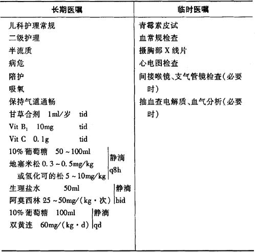 说明:1.重点控制感染,保持气道通畅,维持水、电解质平衡,预防并发症。 2.症状缓解后,改静注激素为口服泼尼松1mg/kg,一般情况好转即可停用激素。 3.并发心衰者按心力衰竭处理。 4.气道梗阻明显者行气管切开。 |