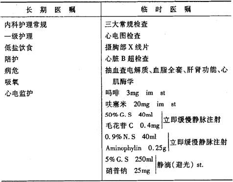 说明:(1)静滴硝普钠时应注意控制滴速,根据血压调整剂量,维持收缩压在100mmHg(1mmHg=0.13322kPa)左右;对原患有高血压病人的血压降低幅度(绝对值)以不超过80mmHg为度。其他可选择的血管扩张剂有硝酸甘油、酚妥拉明。 (2)吸氧采用高流量,并用25%乙醇液湿化。 |