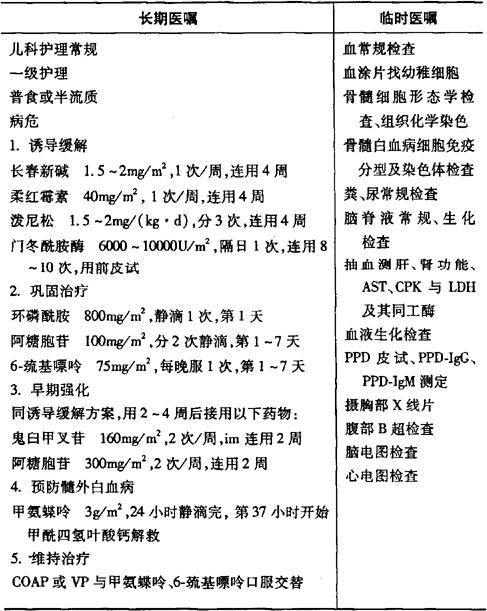 说明:1.白血病一经确定,要早期、足量、联合、常规化疗,但应注意剂量个体化。化疗前如有严重感染,可先进行强有力抗生素治疗2~3天。 2.化疗前外周血白细胞过高者,先用地塞米松或其他较温和的化疗方案[如戊羟尿20~30mg/(kg·d)或VP方案],亦可采用白细胞单采清除术,使白细胞总数降到50×109/L以下后再使用强烈化疗,并同时服用别嘌呤醇,作好水化与碱化。 3.化疗前外周血白细胞太低者,可先用VP方案,随后用G-CSF,白细胞上升后再用强烈化疗。 4.诱导缓解期,柔红霉素可在化疗第1周连用3次,以后3周不用。可用米托蒽醌取代柔红霉素,每次剂量4~6mg/m2。 5.脑膜白血病的防治: (1)鞘注:多采用三联鞘注,MTX 12.5mg/m2,Ara-C 37.5mg/m2,地塞米松5mg/m2,开始每周1次,1个月后每15天1次,以后间隔时间渐长。 (2)颅脑放疗:一般用于3岁以上的高危型或已有脑膜白血病的患儿,于完全缓解6个月开始,总剂量18Gy,分15次于3周完成。为防止骨髓复发,放疗期间用MTX+6-MP口服维持或用VP方案。 (3)大剂量MTX治疗:HDMTX剂量为3~5g/(m2·次),总量的1/6(<0.5g)在30分钟左右快速静滴,余量在24小时左右匀滴,首剂进入后2小时做三联鞘注。第37小时开始用甲酰四氢叶酸钙解救,15mg/m2,q6h,共6~8次,首次静滴,其余肌内注射或口服。有条件者测血浆中MTX浓度,如浓度偏高或毒性反应明显可酌情加用甲酰四氢叶酸钙2~3次。同时使用6-MP50mg/(m2·d),共7天。10~15天重复,连用3次,以后每3个月左右1次,共6~8次。此方案应注意水化与碱化,密切注意MTX的不良反应。特别要注意消化道黏膜损害及骨髓抑制。每疗程开始之前均要作相关检查,只有外周血白细胞大于3×109/L、中性粒细胞大于1.5×109/L,肝、肾功能正常时才能进行。 6.注意化疗药物的副作用,粒细胞缺乏时置层流室,注意口腔、肛周、皮肤护理,使用G-CSF提升粒细胞,一旦发生感染,应尽早进行血培养,联合使用强有力的抗生素。贫血严重或出血严重者输浓缩红细胞或血小板。因化疗反应不能进食者可用静脉营养。 7.高危型与复发型急性淋巴细胞性白血病需采用更强烈的化疗方案,有条件者在缓解后进行造血干细胞移植。 |