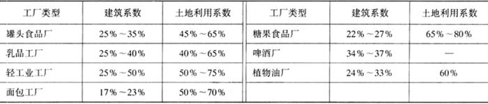 虽然建筑系数尚不能完全反映厂区土地利用的情况,而土地利用系数则能全面反映厂区的场地利用是否经济合理。 部分不同类型的食品工厂的建筑系数及土地利用系数大致如表4-1-3所示。 表4-1-3 不同类型食品工厂建筑及土地利用系数