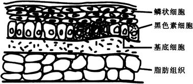 | 释义 | 恶性黑色素瘤和其他皮肤癌 皮肤癌的一般知识 皮肤癌是最常见的恶性肿瘤之一,其中以基底细胞癌最为多见,虽然其转移较为局限,极少累及淋巴结或身体其他部位,也不危及生命,但会引起严重的畸形,从而给患者带来很多痛苦。鳞状细胞癌也是较为常见的皮肤癌,其发病率位居第二。鳞状细胞癌累及范围较为局限,可累及淋巴结或其他远处器官,因而偶尔也可致命。除了以上两种主要的非黑色素瘤皮肤癌(基底细胞癌和鳞状细胞癌)以外,恶性黑色素瘤(通常简称为黑色素瘤)也是一种主要的皮肤癌。黑色素瘤是一种黑色着色性皮肤癌,若不治疗可转移至淋巴结和远处器官如肝、肺和脑等,危及生命。 一般认为,过度日晒是所有皮肤癌最主要的病因,过去20年的科学研究完全证实了这一观点。 科学家们正在致力于寻找皮肤癌的病因和最佳预防方法。过去60年的科学发展使得人们可以拥有冰箱、空调等现代工具,这也在无意中增加了皮肤癌的发病率。使用冰箱、空调使大气中氯氟烃物质的含量增加,消耗了大气中用以过滤大部分有害紫外线的臭氧层。目前,国际社会已达成一致协议:尽可能降低含氯氢烃物质排放量,并且在21世纪初达到完全禁止含氯氢烃物质释放的最终目标。这一协议涉及范围广,加之目前许多国家针对臭氧层耗竭所采取的众多措施,可能意味着实际发生的有害效应不会像预测中的那样显着,21世纪新发皮肤癌的增长可能也并非像预测的那样明显。 皮肤由表面的表皮层和深部的真皮层组成,皮肤癌皆来源于表皮层。图3-4为皮肤的显微镜结构,最表层为鳞状细胞层(鳞状细胞癌来源于此),下面为基底细胞层(基底细胞癌来源于此),基底细胞周围有一些色素细胞,称为黑色素细胞(恶性黑色素瘤来源于此)。