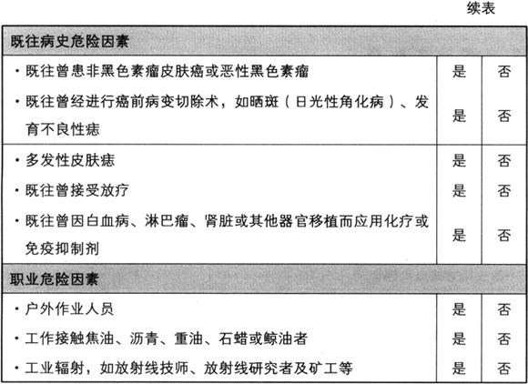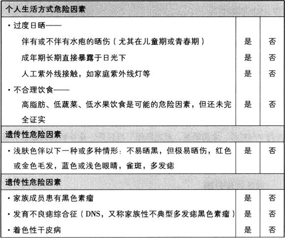 图3-4 皮肤的显微镜结构 基底细胞癌通常没有色素沉着,起病初表现为小的环状珍珠样隆起、肿胀,如长时间不治疗可发展为溃疡。基底细胞癌生长非常缓慢,经过数月甚至数年以后才逐渐长大,通常采取手术切除的方法进行治疗,也可通过放疗或其他手段祛除肿瘤。 鳞状细胞癌通常也是非色素沉着性皮肤癌,其恶性程度比基底细胞癌要高一些。这种皮肤癌早期表现为红色、痂样或鳞屑样溃疡,与基底细胞癌相比,通常生长迅速。鳞状细胞癌的生长范围局限,可转移至淋巴结,若未及时治疗偶尔也会转移至远处器官。通常采用手术切除治疗。 日光性角化病(有时也称作雀斑)为鳞屑样皮肤增厚,呈褐色或红色,通常在过度日晒后出现,可以转变为鳞状细胞癌。由此可见,皮肤因日晒受损后具有发展为皮肤癌的倾向。 恶性黑色素瘤通常为皮肤黑色、不规则的着色。早期恶性黑色素瘤与普通皮肤斑点相似,表面平坦,边界与着色均不规则,可由色素痣或无痣皮肤发展而来。若皮肤的色素沉着外观上发生改变,此时要高度怀疑恶性黑色素瘤。如不及时治疗,病变可先在局限范围内发展,进而累及淋巴结甚至远处器官,如肝、脑及肺等,最终可能危及生命。恶性黑色素瘤的主要治疗方法为手术切除,有时也可以联合化疗治疗。 目前皮肤癌在全球的发病率尚不明确。然而,仅在2003年,美国有500000人发生基底细胞癌,约150000人发生鳞状细胞癌,约40000人发生恶性黑色素瘤。作为世界上皮肤癌发病率最高的国家,2003年澳大利亚估计有150000例非色素瘤性皮肤癌,几乎有一半的人口在有生之年将会罹患某种皮肤癌。 皮肤癌的病因 这里所说的病因泛指所有皮肤癌,针对某种特殊皮肤癌的影响因素,会特别指明。 过度日晒与阳光灼伤(尤其指年幼时) 为各种皮肤癌最主要的独立病因。皮肤癌在西方国家高发,其中有90%的病例与过度日晒有关。儿童期、青春期及青年期过度日晒是各种皮肤癌的重要发病危险因素,尤其是恶性黑色素瘤。皮肤癌的发病风险不仅依赖于急性日光灼伤的次数,也与皮肤日光暴露总时间有关,例如室外工作者或经常进行户外娱乐活动者的皮肤癌罹患风险较高。 遗传倾向 以下人群具有皮肤癌遗传倾向:浅色皮肤者,他们不易被晒黑,但是很容易被晒伤(例如浅肤色、金发碧眼,皮肤有多处雀斑或痣)。肤色由遗传决定,但是尚不能确定浅肤色人、群易患皮肤癌的倾向是否也来自于遗传。非黑色素瘤性皮肤癌家族史增加了皮肤癌的易患风险。另外,皮肤中黑色素细胞越多,皮肤越黑,就越容易晒黑而不易晒伤,因此患皮肤癌的风险也就会随之降低,这也是黑人的皮肤癌发病率最低的缘故。然而尽管白人的恶性黑色素瘤发病率为黑人的40倍,但没有任何人种的皮肤可以绝对幸免于皮肤癌,尤其是恶性黑色素瘤。 遗传性黑色素瘤占所有黑色素瘤的2%,可由遗传性基因突变引发,如CDKN2A基因的突变。家族性痣发育不良综合征(Familial dysp1astic naevus syndrome,DNS),又名家族性不典型多发性痣黑色素瘤综合征(FAMMM),为一种少见的遗传性疾病,受累家族成员可有多处痣(≥50),易发生恶性黑色素瘤,有时也可发生于非日光暴露区域。该综合征可能与CDKN2A基因突变有关,但这一观点尚未得到确证。目前正利用遗传学试验鉴定受累家族成员,从而开展有关研究,并且对其进行治疗。 着色性干皮病为罕见的遗传疾病,受累家族成员易于发生各种皮肤癌。 免疫抑制状态 多见于白血病或淋巴瘤患者,可能是因治疗需要服用免疫抑制剂导致的。同样,由于使用免疫抑制剂以避免或减少排异反应,肾移植或其他器官移植患者也可能发生皮肤癌。 放射线 放射专业的医生和技师及接受工业辐射者(如采矿业或其他行业)也可发生皮肤癌。 多发性皮肤痣、发育不良性痣 多发性皮肤痣是恶性黑色素瘤的重要危险因素,若痣的病理镜检发现异常或发育不良细胞,其风险也会随之增大。 人工紫外线辐射 这种辐射来源可为紫外线机、日光浴及家庭紫外线灯等。皮肤(尤其是上臂皮肤)常年暴露于室内荧光灯可能也是黑色素瘤的危险因素,然而这一观点尚未得到证实。 慢性下肢溃疡 大部分慢性下肢溃疡与下肢静脉曲张有关,若溃疡数年未得到治疗,可发生非黑色素瘤性皮肤癌,但发生率极低。 职业性皮肤癌 除了上面提到的职业性辐射,涉及焦油、沥青、石蜡及重油(包括鲸油)等物质的作业人员也可能发生皮肤癌。此外,由于过度日晒,农民或其他户外作业人员易发生皮肤癌及唇癌。 饮食因素 不合理饮食(低维生素A、低维生素C、低胡萝卜素、高脂肪等)可能也是导致皮肤癌发生的另一因素。近来发现,有规律地饮茶可以帮助预防某些皮肤癌的发生。 你会得皮肤癌吗 若表3-5中有一项或多项为“是”,则该受试者皮肤癌的发病风险高于平均风险水平。若全为“否”则为平均风险水平。 表3-5 皮肤癌的发病危险因素