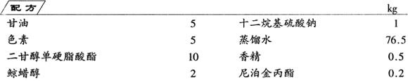 除二甘醇单硬脂酸酯外,将其余成分混合。将二甘醇单硬脂酸酯加热熔化至较高的温度,然后注于上述的混合物中,充分搅拌,混合均匀,即成悬浮胭腈水。