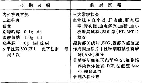 (2)CML其他化疗方法尚有:马利兰2~8mg/d;高三尖杉酯碱(Har)2.5mg/mz+5%G.S500ml,静滴,qd×14,诱导缓解后,每月用7天,维持化疗;阿糖胞苷(Ara-C)20mg/(m2·d)×5d/月或10mg/(m2·d)×10d/月,皮下注射,同时使用α-干扰素。