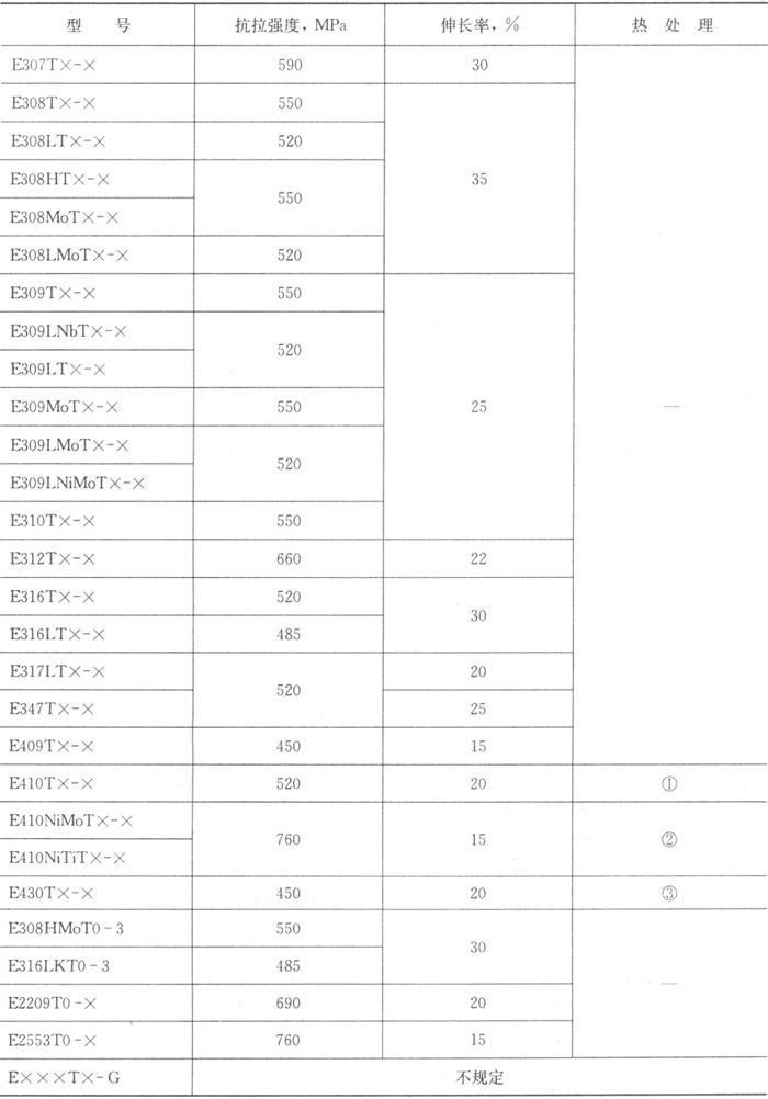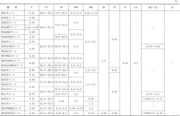 不同型号的焊丝均要求进行熔敷金属化学分析,焊缝射线探伤试验和熔敷金属拉伸试验。对E3××T×-×型号还要求进行焊接接头纵向正弯试验,对R×××T1-5则要求进行接头纵向背弯试验,E316LKT0-3型焊丝的熔敷金属冲击试验由供需双方协商定。 熔敷金属化学成分应符合表3.4-2规定。焊缝射线探伤应符合GB/T 3323中Ⅱ级规定。熔敷金属拉伸性能应符合表3.4-3规定。焊接接头纵向正弯或背弯试样经弯曲后,在焊缝上不应有大于3mm的裂纹等缺陷。 表3.4-2 熔敷金属化学成分(GB/T 17853-1999)