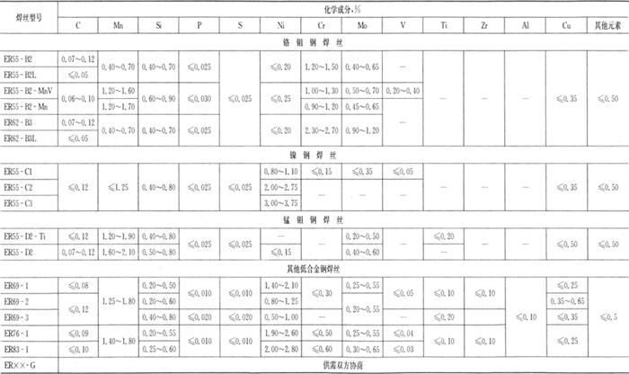 | 释义 | 我国低合金钢焊丝和填充丝标准概述 我国气体保护焊用低合金钢焊丝和填充丝标准共有两个,一是GB/T 8110-1995《气体保护焊用碳钢、低合金钢焊丝》,此标准非等效采用ANSI/AWS A5.28。二是GB/T 14958-1994《气体保护焊用钢丝》,此标准取代GB 1300-1977。 我国国家标准GB/T 8110-1995《气体保护电弧焊用碳钢、低合金钢焊丝》规定了碳钢、低合金钢实心焊丝和填充丝的型号分类、技术要求、试验方法、检验规则及包装等内容,它适用于碳钢、低合金钢熔化极气体保护焊用实心焊丝以及钨极气体保护焊和等离子弧焊用填充丝。 焊丝按化学成分和采用熔化极气体保护焊时熔敷金属的力学性能分类。焊丝型号的表示方法为ER××-×,字母ER表示焊丝,ER后面的两位数字表示熔敷金属的最低抗拉强度,短划“-”后面的字母或数字表示焊丝化学成分分类代号。如还附有其他化学成分时,直接用元素符号表示,并以短划“-”与前面的数字分开,举例如下: