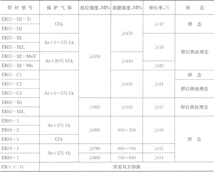 焊丝的化学成分应符合表2.3-1的规定,熔敷金属拉伸试验结果应符合表2.3-2的规定,熔敷金属夏比V型缺口冲击试验结果应符合表2.3-3的规定。在表2.3-2中同时列出了低合金钢焊丝在焊接时所采用的保护气体以及在试验时的热处理状态。 表2.3-1 低合金钢气体保护焊焊丝化学成分(GB/T 8110-1995)