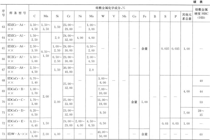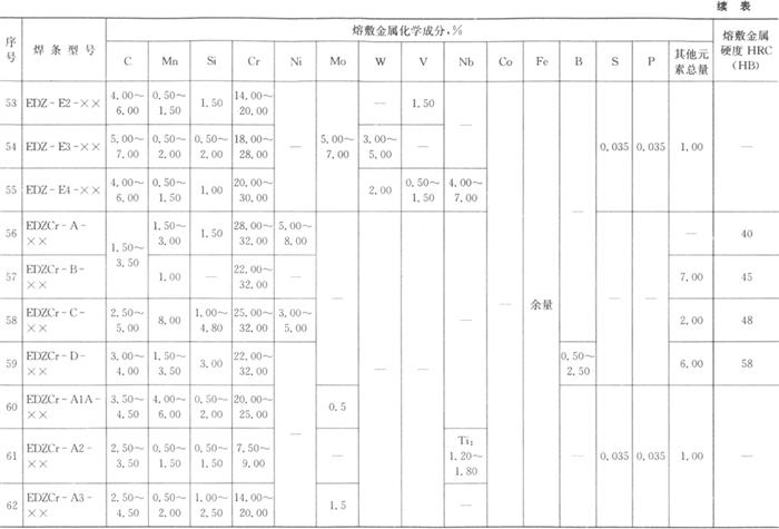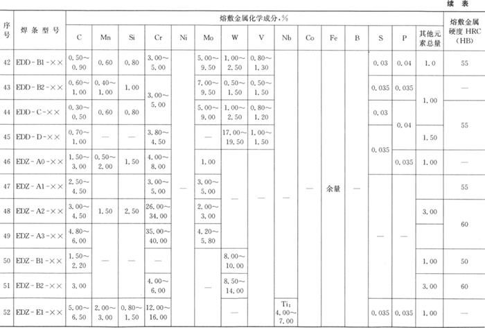 熔敷金属的化学成分和硬度应符合表4.2-5的规定。 表4.2-5 熔敷金属化学成分及硬度(GB/T 984-2001)
