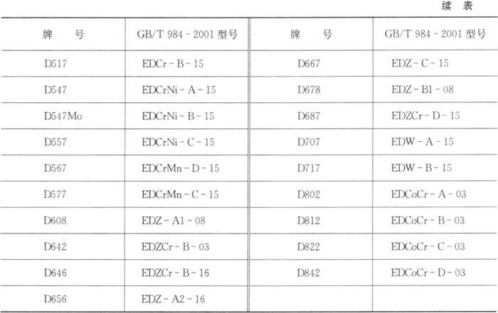 注:1.若存在其他元素,也应进行分析,以确定是否符合“其他元素总量”一栏的规定。 2.化学成分的单值均为最大值。硬度的单值均为最小平均值。 3.为经热处理的硬度值,热处理规范在说明书中规定。 对化学分析(焊条Φ3.2、Φ4.0、Φ5.0)试验,取样位置距试板上表面最小距离应为16mm。对硬度试验,试件应以平焊位置施焊,试件应至少堆焊4层,每道焊缝宽度不应大于焊条直径的4倍。堆焊时每焊完一道,应冷却至(100±10)℃再开始焊下一道焊缝。 在GB/T 984-2001标准中,堆焊焊条共分为14个类型80个型号,其中EDP型有17个型号,EDR型有7个型号,EDCr型有3个型号,EDMn型有6个型号,EDCrMn型有4个型号,EDCrNi型有3个型号,EDD型有5个型号,EDZ型有10个型号,EDZCr型有12个型号,EDCoCr型有5个型号,EDW型有2个型号,EDTV型有1个型号,EDNi型有2个型号,加上EDGWC型碳化钨管状堆焊焊条还有3个型号(每个型号有5个不同的碳化钨颗粒度)。 在标准的附录A中,简要地介绍了上述14个类型堆焊焊条的性能及其用途,下面还将对这些焊条的应用进行详细讨论。 国内生产的堆焊焊条有时还用牌号来表示,牌号的开头为英文大写字母D,表示堆焊焊条,后面跟3个阿拉伯数字如D327、D802等,3位数的末位数代表药皮类型,其中2为钛钙型,6为低氢钾型,7为低氢钠型,8为石墨型。按1997年机械工业部编制的《焊接材料产品样本》中堆焊焊条牌号规定,根据“主要用途”来划分,堆焊焊条共分九大类: D00×-09× 不规定 D10×-24× 不同硬度常温堆焊焊条 D25×-29× 常温高锰钢堆焊焊条 D30×-49× 刀具工具堆焊焊条 D50×-59× 阀门堆焊焊条 D60×-69× 合金铸铁堆焊焊条 D70×-79× 碳化钨堆焊焊条 D80×-89× 钴基合金堆焊焊条 D90×-99× 待发展堆焊焊条 表4.2-6为部分堆焊焊条牌号与相应型号的对照表。 表4.2-6 部分堆焊焊条牌号与GB/T 984-2001型号对照