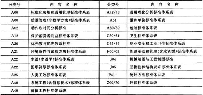 图13.1-4 工作标准体系基本组成图 上述各类标准体系结构图操作上应结合企业具体情况加以绘制。 (3)标准体系表。GB/T 13017-91中给出企业标准体系表的定义:“标准体系内的标准按一定形式排列起来的图表。” 标准体系表的组成单元是标准,不是产品。 标准体系表包括在一定时期内、一定范围的标准体系应有的全部标准,即包括应该保留的现有标准,以及应该改订、重订和修订的标准。 标准体系表内的标准,是按照一定形式排列起来的,以表示标准之间的内在联系和依存制约的关系,这种排列形式,一般表现为标准的分类组合和层次结构。其具体表现形式可以是一张表或一张结构图。主要形式为:从高到低按系统排列的层次结构。图13.1-5为全国、行业、专业标准体系表。企业应采用和贯彻表中所列的有关标准编制本企业的体系表。 全国标准体系表第一层标准 全国通用综合性基础标准体系表