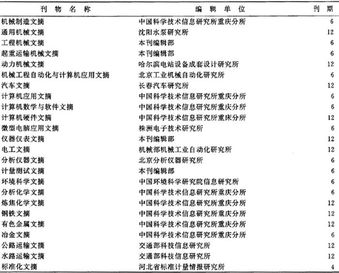 另外,我国目前检索刊物的编辑出版工作仍然是专业分口、分散编辑的。由于专业的范围经常随着某些行政部门的拆或合而变化,不如学科的范围稳定,所以一直强调“以学科为主,兼顾专业,并尽量保持学科的系统性”的办刊原则,保持检索刊物内容上的完善和稳定。目前,我国的检索刊物基本上是按这一原则,从原有基础出发,来设置和划分学科分册的。 3.目前我国检索期刊体系中的主要系列 经全国编委会协调后的检索期刊,初步走上了健全发展的道路。但是,我国的检索刊物体系在实际编辑出版过程中,仍然不够稳定和成熟,诸如停刊、合并、改名、创刊等变动情况时有发生。据1988年底的初步统计,我国的科技文献检索刊物主要有如下三种系列: (1)“科技资料目录”系列 它们都是以题录为主,带有少量文摘和简介的检索刊物。在过去时期内,曾占主要地位,目前其地位已日益被文摘刊物所取代,编辑出版日渐萎缩。 ①《中文科技资料目录》(简称“中目”) 这是专门报道国内科技文献的一套检索期刊。该刊是在1977年石家庄会议的推动下,通过统一协调和有关单位的努力,由一些专业信息所陆续创办起来的。该刊创办初期为题录性期刊,现有二分之一已采用题录、简介、文摘三结合的报道形式。分册数目最多时1980年达到22个。1981年以后,陆续有一些分册停刊、合并或改刊,目前仍保留有部分分册。该刊收编的文献取自国内公开出版和内部发行的期刊、各大学学报、专业学术会议论文、科技报告、出国考察报告、图书及标准文献等。这套中文检索期刊的出版,初步改变了国内科技文献管理混乱、使用不便的落后状况,对充分发挥中文科技文献的作用做出了重要贡献。 ②《国外科技资料目录》(简称“外目”) 这是专门报道国外科技文献的一套检索期刊。该刊是在前些年各专业信息所或图书馆陆续恢复或创办起来的题录刊物的基础上,于1977年以后由全国编委会统一协调、统一命名为《国外科技资料目录》的,其发展前身可追溯到《科技文献索引》期刊部分和特种文献部分的合并出版或更早。这套题录性刊物最多时达到36个分册,由于其中一些分册已经演变为文摘刊物,有些则停刊或与其他刊物合并,所以目前仅剩七个分册。它的报道内容取材于国内收藏的国外期刊、特种文献、会议录、图书、技术标准及专利文献等等。报道形式也有一半的分册采用了题录、简介、文摘三结合的方式。所报道的文献原文可从国内各有关单位获得。 ③《国外科技资料馆藏目录》(简称“馆目”或“特目”) 这是专门报道中国科学信息研究所馆藏特种文献的一套馆藏目录式检索刊物。其发展前身是早年的《科技文献索引》(特种文献部分)。到1977年改为现名。它最多时有16个分册,后有一些分册先后编入“外目”中的相应分册,故到1986年底只剩下13个专业分册,目前只是不定期地零星出版。该刊为题录性刊物(兼有少量简介文摘)。它的报道范围包括各国政府报告、会议资料、学位论文及研究机构(学术团体)的技术报告。由于该刊只报道中国科技信息研究所的馆藏文献,所以原文在该所均能获得。这些特种文献通常不公开出版,搜集困难。 (2)文摘刊物 这是一套以文摘的形式报道国内或国外出版的期刊、会议录、特种文献等科技文献的检索刊物,是我国检索刊物的主干发展方向。按其面向的学科或专业而分很多分册,并有统一的命名,如报道国外文献的为《国外××文摘》或《××文摘》。报道国内文献的为《中国××文摘》,其中少量分册兼顾国内、国外的文献报道。所有专业分册中,有一部分是在“文革”中停办而后来复刊的,有一部分是从原来的《国外科技资料目录》或《中文科技资料目录》的分册发展演变而成的,还有一部分是近几年随着科学研究的发展而新创办的。目前,有《中国××文摘》共20个分册,最多时曾达31个分册;有《××文摘》共50个分册,最多时共有84个分册,初步形成了门类齐全、分工细致的文摘类检索刊物体系。 《中国××文摘》系列中的部分刊物: 《中国力学文摘》、《中国物理学文摘》、《中国数学文摘》、《中国地理科学文摘》、《中国地质文摘》,《中国石油文摘》、《中国化工文摘》、《中国无机分析化学文摘》、《中国冶金文摘》、《中国航空文.摘》、《中国机械工程文摘》、《中国电子科技文摘》、《中国无线电电子学文摘》、《中国核科技文摘》等等。 表2.2.2-2 《××文摘》(又称国外文摘)系列中的部分刊物一览表