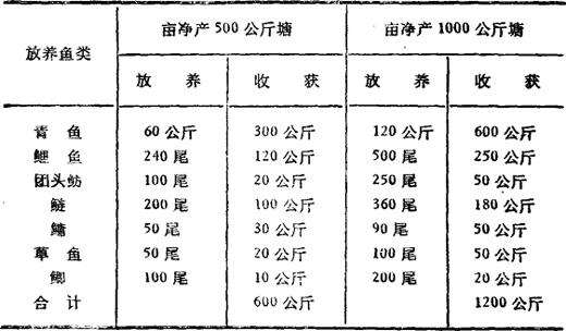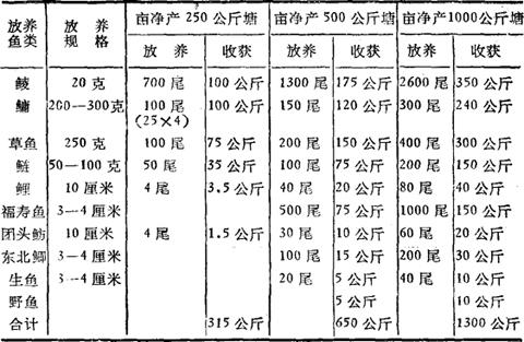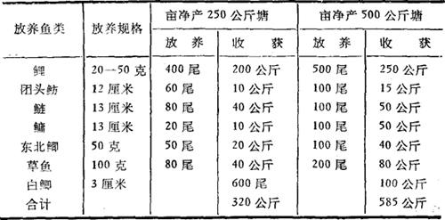 | 释义 | 我国池塘养鱼主要类型 我国池塘养鱼,一般放养6-8种鱼,以一二种鱼为主,称为“主养鱼”,其余为“配养鱼”。主养鱼对提高产量起主导作用,配养鱼主要靠主养鱼的剩饵残屑、排泄物等肥水所繁殖的浮游生物和底栖生物为食。具体搭配放养虽千变万化,但其基本形式见表2-61至表2-66。 表2-61 以青鱼为主的搭配放养模式