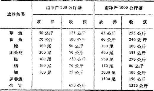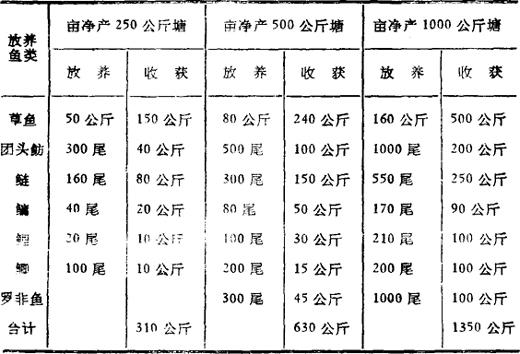 以上三个模式是长江流域以投喂天然饵料(水草螺蚬)为主,普遍采用的三种基本的传统放养模式。三种模式各有优点,以草鱼和团头鲂为主的,饲料来源丰富;以青鱼和草鱼为主的,可提高“肥水鱼”产量,有利降低成本;以青鱼为主的,浮头少,容易获得高产,优质鱼比例大。具体放养量随各种条件而有所变化,但搭配原则基本上是一致的。 放养规格可以根据轮捕和留种计划,按前述原则确定。青鱼、草鱼、鲢、鳙,团头鲂都可放2-3种规格,除青鱼外还可分别套养夏花数百尾至数千尾(以上三种放养模式均不包括套养夏花数)。 “吃食鱼”能带养“肥水鱼”的比例,随不同放养模式和单产水平而有不同,一般“吃食鱼”和“肥水鱼”的净产比例是:青鱼和草鱼并重池,净产500公斤以下的为0.8-1∶1或6∶4,净产1000公斤的为1∶0.5;青鱼池500公斤以下的为3∶1,1000公斤的为4∶1;草鱼池500公斤以下的为2∶1,1000公斤的为3∶1。“肥水鱼”的配养比例均随单产的提高而下降。在以肥料养“肥水鱼”为主,或有较多的精饲料时,搭配放养比例可不受上述比例限制。新养鱼地区,由于技术差,缺乏管理经验,可以罗非鱼为主,亩放千余尾,适当搭配其他鱼类,这样也可亩产300-500,使罗非鱼达100-150克。 用白鲫可取代鲢的80-90%时,白鲫的放养数可根据计划产量、出塘规格要求和一般生长速度来确定,或者按3-5尾白鲫抵1尾鲢来计算放养数。 不放罗非鱼可增放鲢、鳙,但总产会稍低些。 表2-64是珠江流域的放养模式,鲢鳙可放2-3种规格,实行轮捕,或者分四批轮放。轮捕。 表2-65是适于北方采用的放养模式。表2-66是根据一般生产经验按较理想的要求设计的,因为多种原因结果会有所不同。其放养的鲢鳙鱼种应在夏季分2-3次轮捕上市。夏花鲢鳙一般放一种,放养时间要看鲢鳙的生长情况而定,一般在6-7月间。取这种放养方式,只有一口塘的养鱼户,只要购买青鱼、草鱼的一龄鱼种和其他鱼的夏花即可。如能买到草鱼早繁苗,或稀放发塘的常规苗,在7月底前达到8厘米以上时,也可直接套入成鱼池,这样可大大降低生产成本,提高经济效益。 放养的基本模式,除以上六种外,还有以鲢、鳙或罗非鱼为主的,但是除鲢、鳙的搭配比例和前述几种模式相同外,其余没有比较统一的搭配比例,要根据饲料来源来决定。一般草量多可多放草鱼,有螺蚬可多放青鱼,有精饲料可增加“吃食鱼”的数量。 选何种放养模式,要根据鱼池、气候、饲料、苗种来源和技术等条件及市场需要来决定。具体放养种类、数量、规格和搭配比例,仅适于我国传统养鱼方法的一般情况,但放养数量与放养规格,在重量上成正相关,在尾数上成反相关,即规格大,重量多些,尾数少些;反之规格小,重量少些,尾数多些。 |