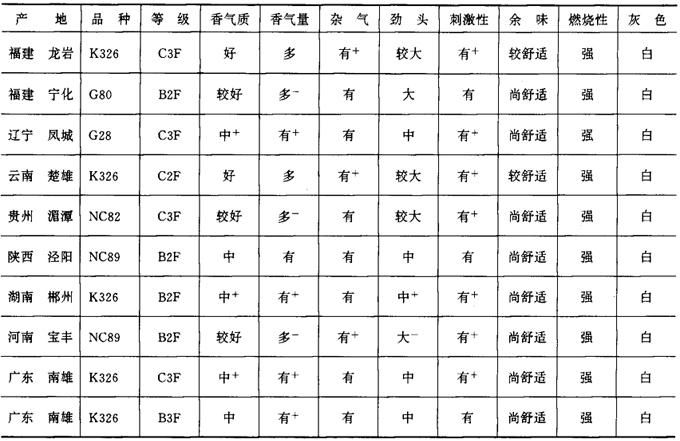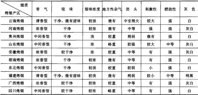 | 释义 | 我国烤烟烟叶质量和使用特性 (一)我国烤烟烟叶质量的差异 我国幅员辽阔,各地气候、土壤条件不同,种植品种不同,生产出的烤烟在烟质特性上也存有较大差异。 在同一省内的不同生态条件下,烤烟香味风格有较大差异。如湖南、贵州、四川等省内均有部分产地烟叶是较优良的清香型原料;陕西省南部和北部产区烟叶、河南省西部和其他产区的烟叶质量也存有较明显的差别。对各省烟叶质量不能一概而论,在叶组配方使用中需注意小地区的差异。 我国烤烟烟叶质量近年正处于改进演变过程中。50年代末到80年代初期,各地追求烟叶高产,烟叶质量下降,烟碱含量降低,香味变淡,黄淮和东北烟区尤为明显。80年代末,各地区重视烟叶质量,采用引进国外良种和先进栽培调制技术,增施肥料,抓烟叶成熟度等方法,烟叶质量明显提高,烟碱含量也有所增加,但部分烟叶烟碱含量偏高,烟味过浓。为适应卷烟工业对烟叶原料的要求,调整了施肥量等栽培技术措施,1993年以后烟叶烟碱含量有些下降趋势,但各地进展很不平衡,导致烟叶内在烟质也不一致。所以,必须根据不同年份、不同小地区和不同批次烟叶评定质量。在购进烟叶和工业配方使用前必须进行质量检测,按实际烟质进行配方应用。 下面提供一些烟叶质量特性数据,仅可供一般参考。 (二)我国烤烟产区烟叶质量一般特性 见表4-1-15。 表4-1-15 我国烤烟产区烟叶质量一般特性