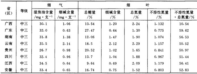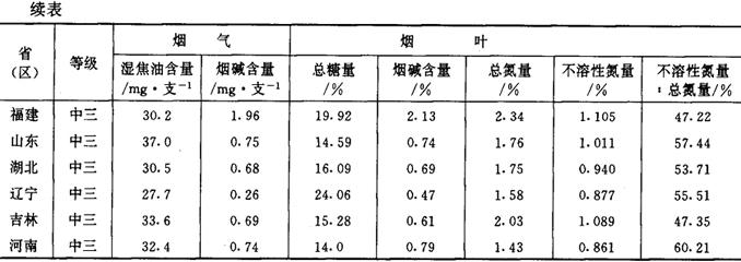 (五)我国部分省(区)优质烤烟烟叶化学成分与烟质评吸结果 见表4-1-18和表4-1-19。 表4-1-18 我国部分省(区)优质烤烟(试点)烟叶化学成分
