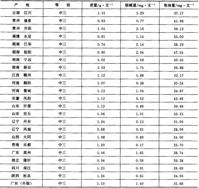 (四)我国主要烤烟产区烟叶烟碱和焦油含量 见表4-1-17。 表4-1-17 我国主要烤烟产区烟叶烟碱和焦油含量