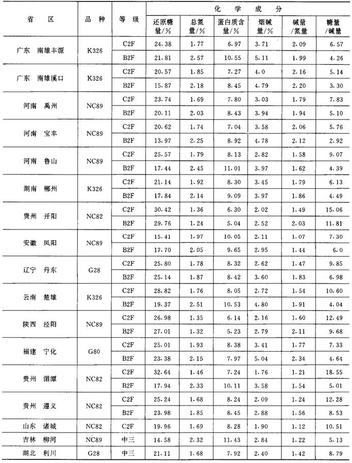 (三)我国烤烟产区烤烟烟叶化学成分 见表4-1-16。 表4-1-16 我国烤烟烟叶化学成分表