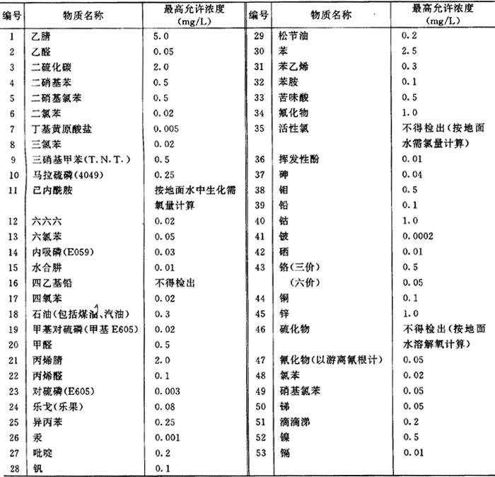注:①造纸、制革、脱脂棉<300mg/L (2)地面水中有害物质的最高容许浓度(表7.2.2-3,摘自《工业企业设计卫生标准TJ36-79》) 表7.2.2-3 地面水中有容物质的最高容许浓度