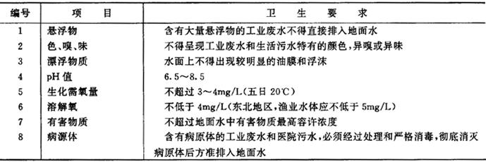 注:表中所列各项指标和有害物质的检验方法,应按卫生部批准的现行《地面水水质监测检验方法》执行。 (3)地面水水质卫生要求 (表7.2.2-4,摘自《工业企业设计卫生标准TJ36-79》) 表7.2.2-4 地面水水质卫生要求