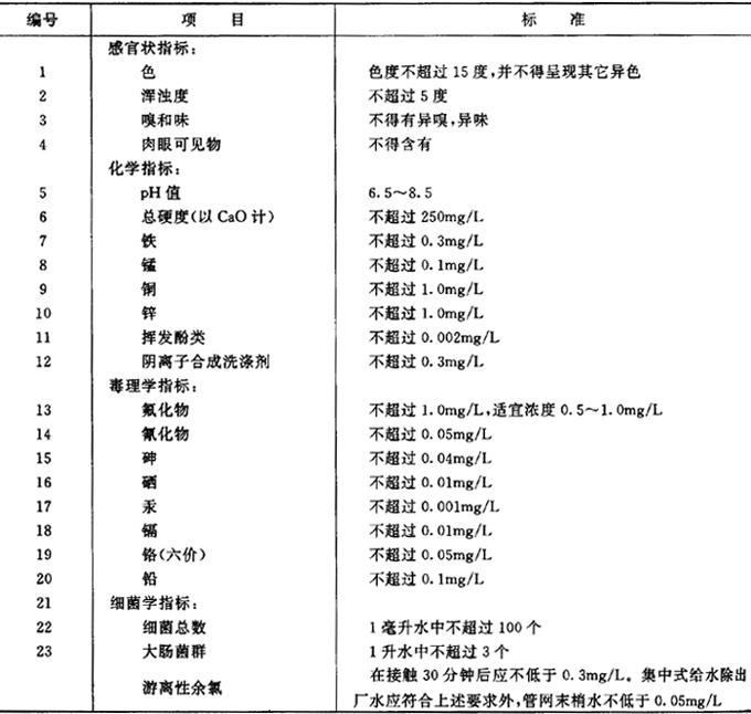 (4)生活饮用水水质标准 (表7.2.2-5,摘自《生活饮用水卫生标准TJ20-76》) 表7.2.2-5 生活饮用水水质标准