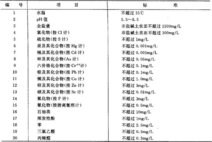 注:放射性物质的标准,应按现行的《放射防护规定》中关于露天水源中放射性物质限制浓度的规定执行。 (6)农田灌溉用水水质标准 (表7.2.2-7,摘自《农田灌溉水质标准TJ24-79》(试行)) 表7.2.2-7 农田灌溉用水水质标准