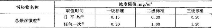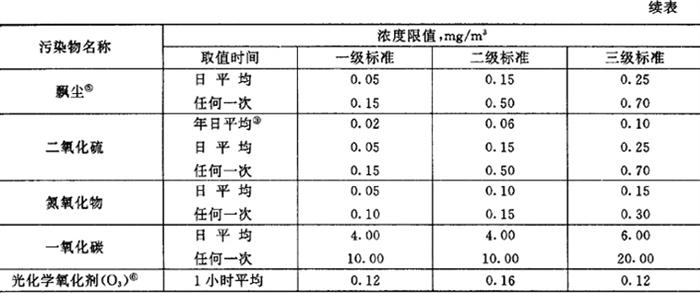 注:放射性物质的标准。应按现行的《放射防护规定》中关于露天水源中放射性物质限制浓度的规定执行。 工业废水和其它污水排入用于灌溉的地面水源时,应分别符合下列要求: ①工业废水,除应按现行的《工业企业设计卫生标准》、《工业“三废”排放试行标准》的有关规定执行外,还应保证排入后,其下游最近的灌溉取水点的水质符合本标准。 ②城市污水,应经必要处理,并保证排入后,其下游最近的灌溉取水点的水质符合本标准。 2.大气环境质量标准 (1)标准的分级和限值 ①大气环境质量标准 一级标准为保护自然生态和人群健康,在长期接触情况下,不发生任何危害影响的空气质量要求。 二级标准为保护人群健康和城市、乡村的动、植物,在长期和短期接触情况下,不发生伤害的空气质量要求。 三级标准为保护人群不发生急、慢性中毒和城市一般动、植物(敏感者除外)正常生长的空气质量要求。 ②空气污染物三级标准浓度限值(表7.2.2-8) 表7.2.2-8 空气污染物浓度限值