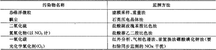 注:①“日平均”为任何一日的平均浓度不许超过的限值。 ②“任何一次”为任何一次采样测定不许超过的浓度限值。不同污染物“任何一次”采样时间见有关规定。 ③“年日平均”为任何一年的日平均浓度均值不许超过的限值。 ④总悬浮微粒(T.S.P)系指100微米以下微粒。 ⑤飘尘,系指10微米以下的微粒,该项为参考标准。 ⑥光化学氧化剂(O3),1小时均值每月不得超过一次以上 ③大气环境质量区的划分及其执行标准的级别 根据各地区的地理、气候、生态、政治、经济和大气污染程度,确定大气污染质量区分为三类: 一类区 为国家规定的自然保护区、风景游览区、名胜古迹和疗养地等。 二类区 为城市规划中确定的居民区、商业交通居民混合区、文化区、名胜古迹和广大农村等。 三类区 为大气污染程度比较重的城镇和工业区以及城市交通枢纽、干线等。 一类由国家确定,二、三类区以及适用区域的地带范围由当地人民政府划定。 各类大气污染质量区执行标准的级别规定如下: 一类区一般执行一级标准。 二类区一般执行二级标准。 三类区一般执行三级标准。 凡位于二类区内的工业企业,应执行二级标准;凡位于三类区内的非规划的居民区,应执行三级标准。 ④监测方法(表7.2.2-9) 7.2.2-9 标准中各项污染物的监测分析方法