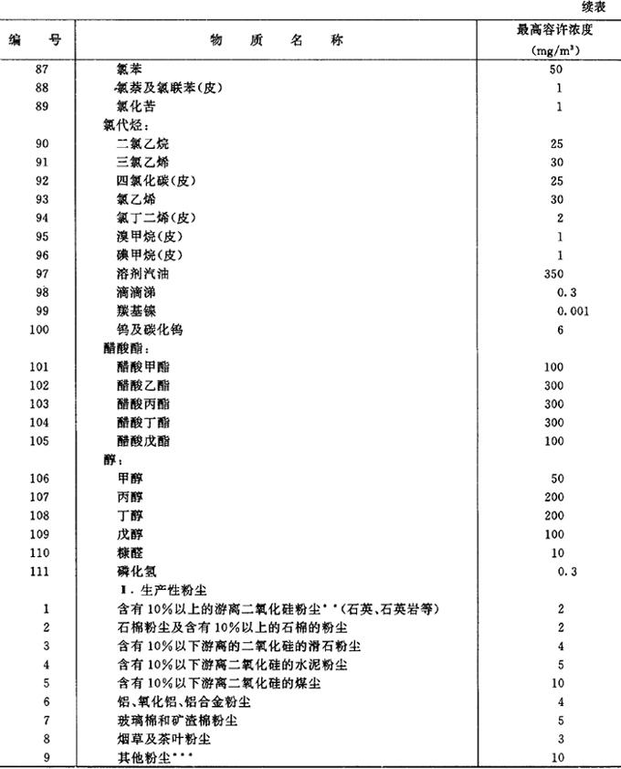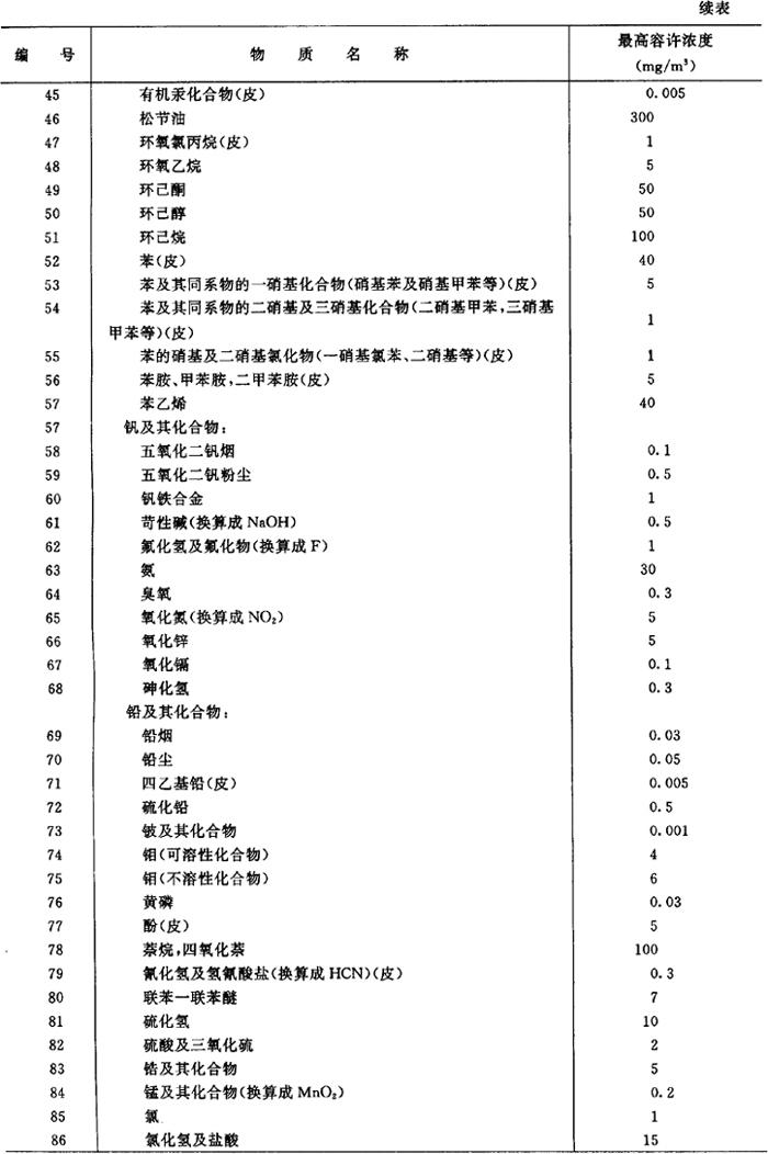 (2)车间空气在有害物质的最高容许浓度 (表7.2.2-10,摘自《工业企业设计卫生标准BJ36-79》) 表7.2.2-10 车间空气中有害物质的最高容许浓度