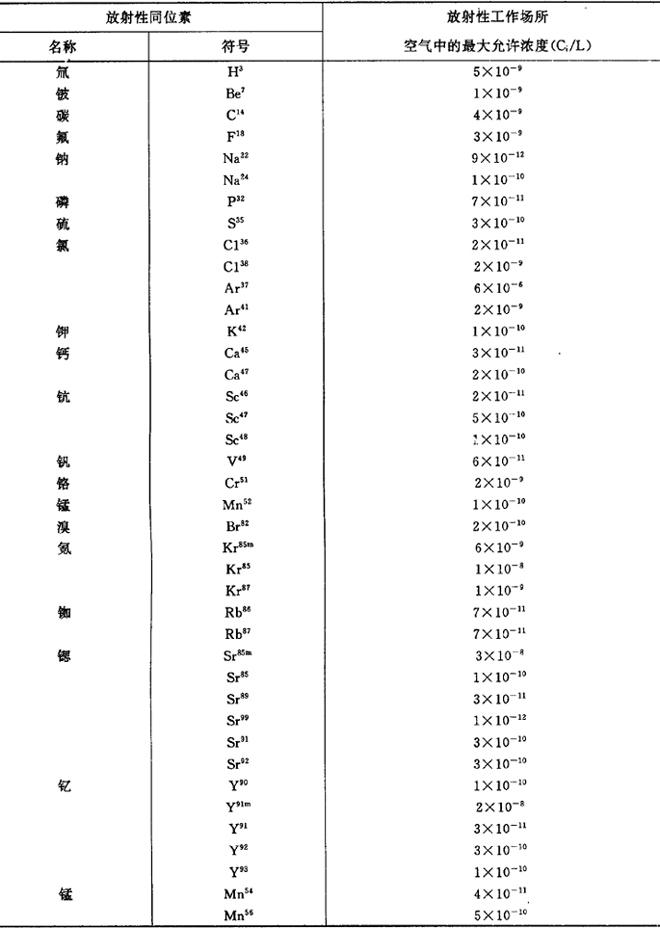 注:①表中最高容许浓度是工人工作地点空气中有害物质所不应超过的数值。工作地点系指工人为观察和管理生产过程而经常或定时停留的地点,如生产操作在车间内许多不同地点进行,则整个车间均算为工作地点。 ②有(皮)标记者为除经呼吸道吸收外,尚易经皮肤吸收的有毒物质。 ③工人在车间内停留的时间短暂,经采取措施仍不能达到上表规定的浓度时,可与省、市、自治区卫生主管部门协商解决。 *一氧化碳的最高容许浓度在作业时间短暂时,可予放宽:作业1小时以内,一氧化碳浓度容许达到50mg/m3;半小时以内为100mg/m3;15~20分钟为200mg/m3。在上述条件下反复作业时,两次作业时间需间隔2小时以上。 * *含有80%以上游离二氧化硅的生产性粉尘,宜不超过1mg/m3。 * *其它粉尘系指游离二氧化硅含量在10%以下,不含有害物质的矿物性和动植物性粉尘。 ④本表所列各项有毒物质的检测方法,应按卫生部批准的现行《车间空气监测检验方法执行》。 (3)放射性同位素在放射性工作场所空气中的最大允许浓度(7.2.2-11) 表7.2.2-11 放射性同位素在放射性工作场所空气中的最大允许浓度