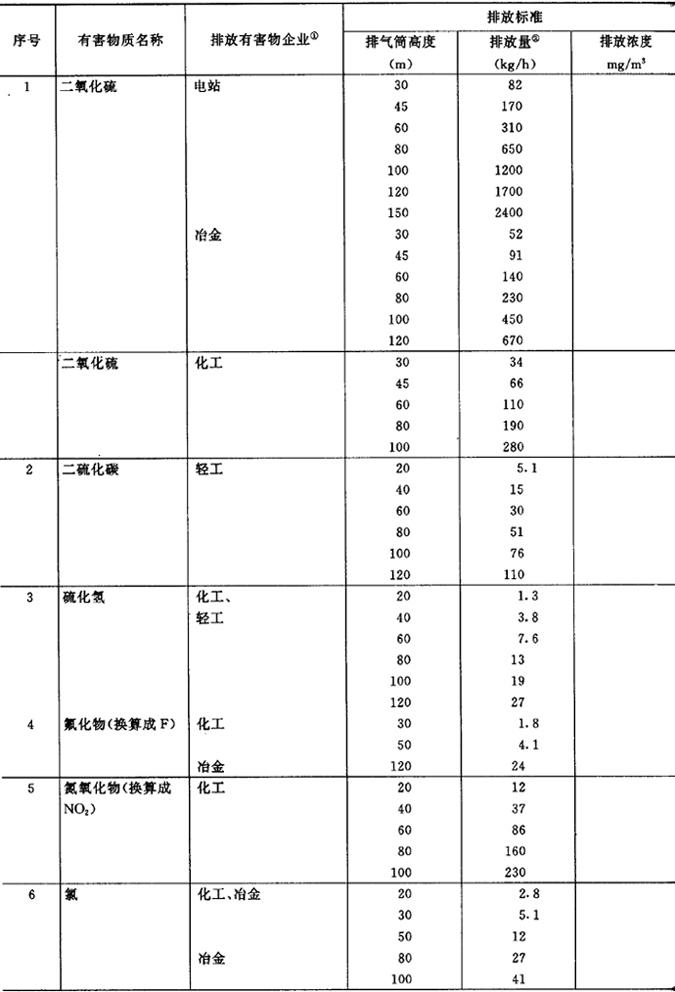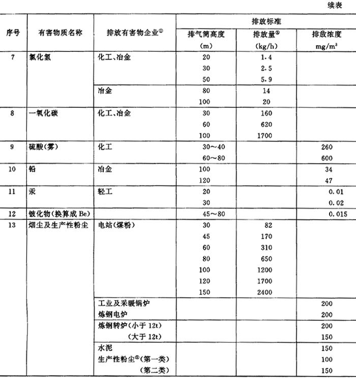 (4)废气排放标准(摘自《工业“三废”排放试行标准GBJ4-73》) 废水排出口有害物质的排放量(或浓度)不得超过表7.2.2-12的规定。 表7.2.2-12 十三类有害物质的排放标准