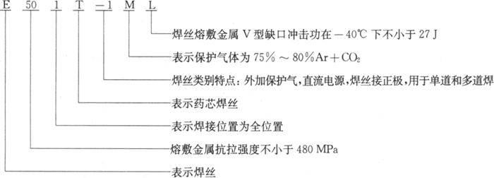 | 释义 | 我国碳钢药芯焊丝标准概述 我国国家标准GB/T 10045-2001《碳钢药芯焊丝》是国家质量监督检查检疫总局于2001年发布的。此标准规定了碳钢药芯焊丝的型号分类、技术要求、试验方法、检验规则及缠绕、包装等内容。GB/T 10045-2001是对GB/T 10045-1988进行的修订,在技术内容上等效采用ANSI/AWS A5.20-1995。 药芯焊丝型号是根据熔敷金属的力学性能、焊接位置以及焊丝类别特点(包括保护类型、电流类型、渣系特点等)进行分类的。 碳钢药芯焊丝型号的表示方法如下: