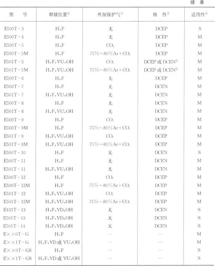 ③这些型号主要用于单道焊接而不用于多道焊接,因为只规定了抗拉强度,所以只要求做横向拉伸和纵向辊筒弯曲(缠绕式导向弯曲)试验。 表1.4-3 焊接位置、保护类型、极性和适用性要求(GB 10045-2001)