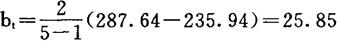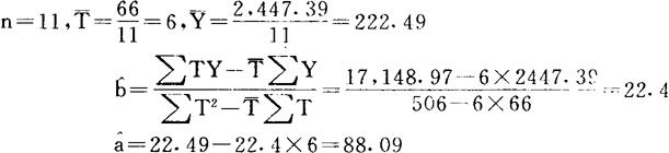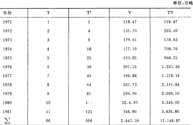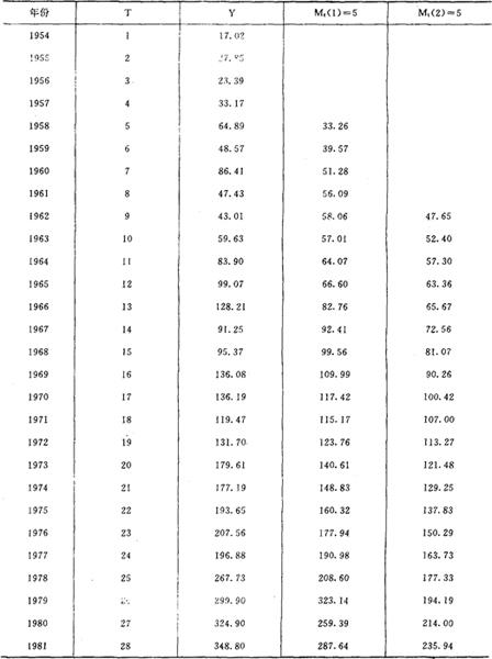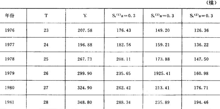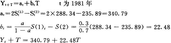(2)用移动平均法预测 移动平均法模拟方程为 Yt+T=at+btT 式中:t-时期; a、b-t时期的系数; T-从t期算起预测的时期数; Yt+T-T期的预测值; at=2Mt(1)-Mt(2) bt= 式中:Mt(1)、Mt(2)-分别为t期的一次移动和两次移动平均数,N-分段数据点数。 列出二次移动平均数据,见表4。表5中移动周期总数N=51981年为t周期,那么根据表中1981年数据可算出 表4