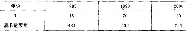 于是移动平均法预测模型为 Y1=339.34+25.85T 现在利用模型对1985、1990、2000年进行预测,即将T等于4、9、19的数值分别代入方程,就可得到所要的预测值,见表5。 表5 移动平均法预测结果 单位:万吨