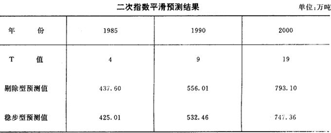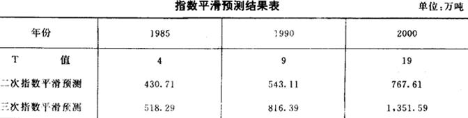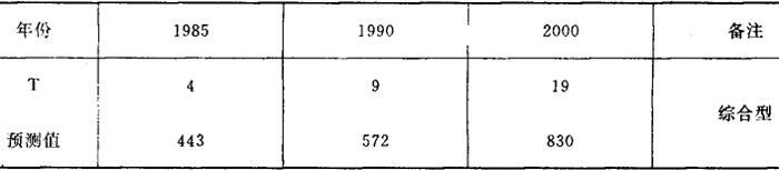 所以三次指数平滑预测模型为: Yt+T=351.81+33.64T+2T2 根据上述两个模型对1985年(T=4)、1990年(T=9)、2000年(T=19)预测的结果,见表7。 表7