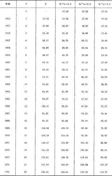 式中:s(1)t-为第t期一次指数平滑值。 a-加权系数,一般在0.01~0.30之间,根据数据变化 较大时a值应偏高的原则,我们取a为0.3。 Yt-t时期的数据。 各次平滑的初始值取为初期Y值,即17.02。按照上述公式,做出如下指数平滑表,见表6。 表6 指数平滑表(综合型)