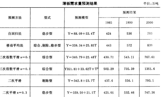 表9中列出的6种预测结果中除三次指数平滑预测值以外,其余的5种预测值是非常接近的。即1985年预测值在424~443万吨之间;1990年的预测值在532~572万吨之间;2000年的预测值在760~830万吨之间。所以,我们认为这5种预测结果是比较可靠的。另一方面,从薄板消费量图中看出,消费是随时间而增加,且增加速度越来越快,是一个凹向上的曲线。因此,我们选定这5种预测结果的上限值,即移动平均法的预测结果。合理的预测值拟定为:1985年消费量450万吨,1990年消费量570万吨,2000年消费量830万吨。 |