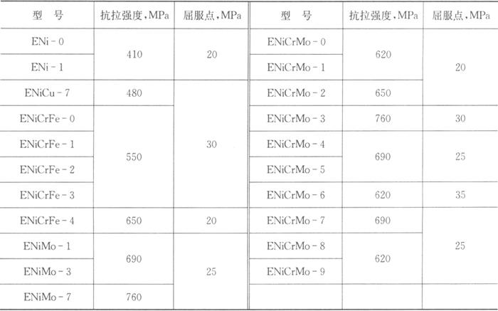 注:1.在对本表中规定的化学元素进行分析时,如果发现存在其他元素,则应进一步分析,分析结果不应超过其他元素总量。 2.表中所列单个值,除有其他规定,则均为最大值。①含镍量包括附带的钴。②钴——有要求时最大为0.12。③钼——有要求时最大为0.30。④铌——有要求时最大为2.5。 表5.2-2 熔敷金属力学性能要求(GB/T 13814-1992)