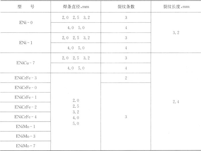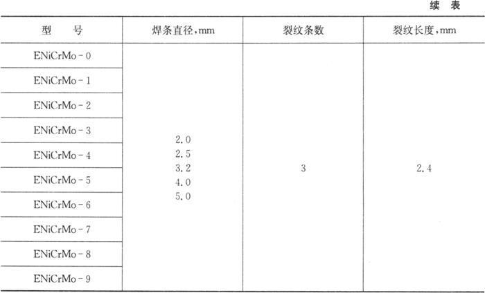 注:药皮类型中,3表示焊条药皮为钛钙型;15表示焊条药皮为低氢钠;16表示焊条药皮为低氢钾。 焊条熔敷金属化学成分应符合表5.2-1的规定,焊条熔敷金属的力学性能应符合表5.2-2的规定,除熔敷金属的力学性能试验外,还应对焊接接头进行弯曲试验。对于直径2.0mm的焊条应做两个横向正弯试验,对于其他直径的焊条,应做三个横向侧弯试验。试样厚10mm,弯曲直径40mm,每个试样弯曲表面的裂纹条数和单个裂纹长度应不超过表5.2-3的规定,但长度小于0.4mm的裂纹及试样棱角上的裂纹不计。 表5.2-1 熔敷金属化学成分(GB/T 13814-1992)